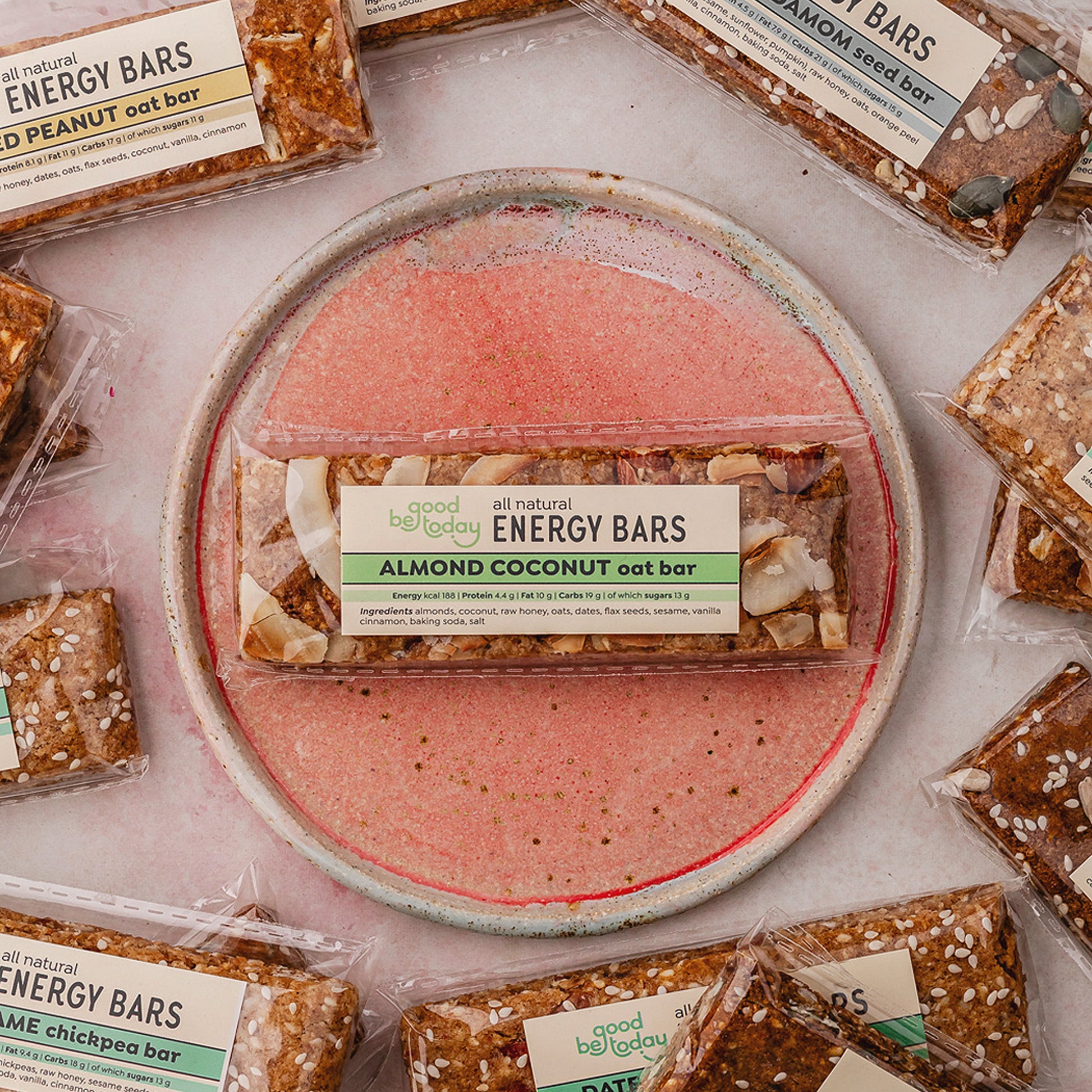 Nourishing bars packed with plant based protein and dietary fibre and naturally sweetened with dates and raw honey. Made with caramelized almonds, toasted coconut flakes, wholegrain oats, creamy sesame, peanuts, flax seeds and a hint of cinnamon. Free from gluten, dairy, with no oil or additives added