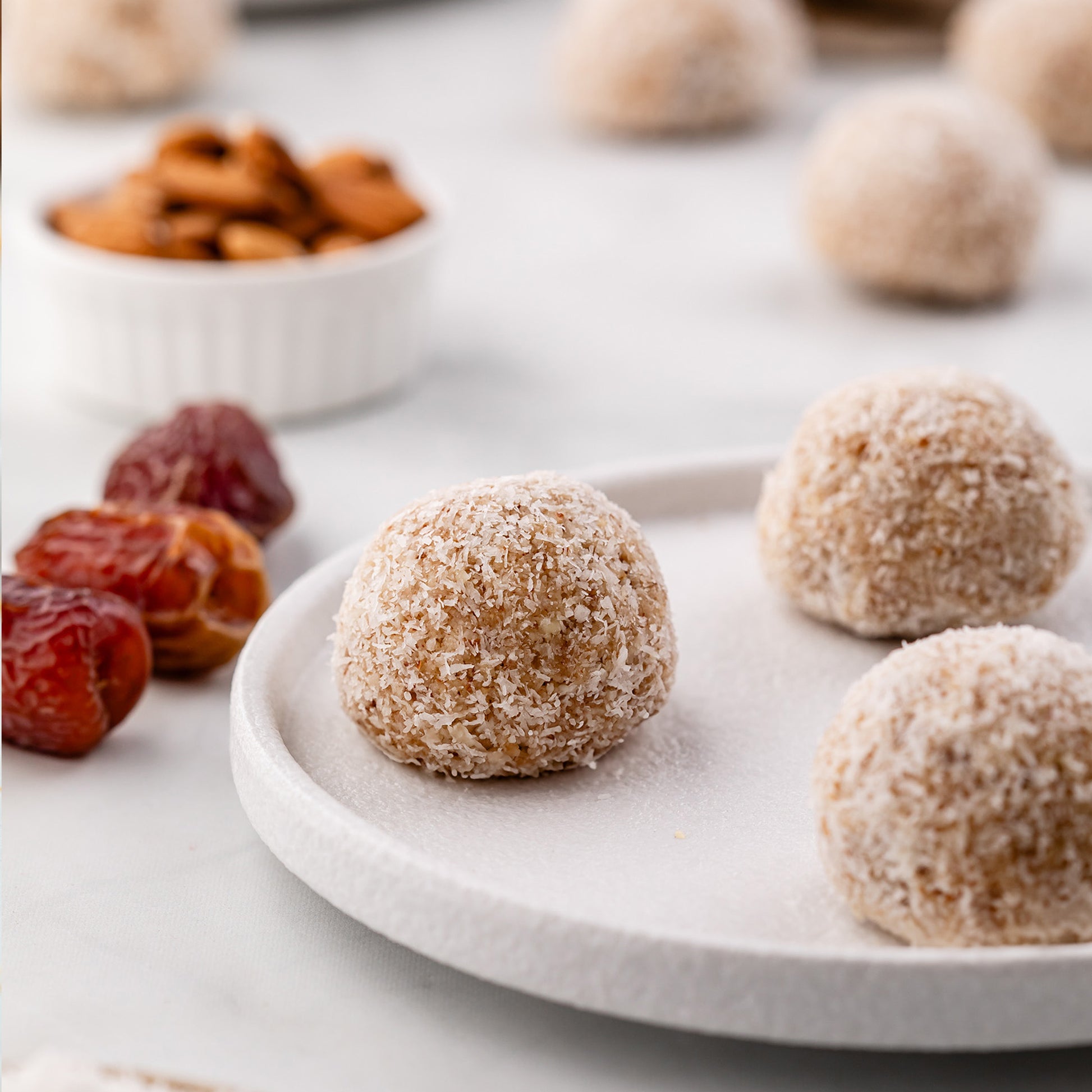 Delicious balls made with coconut & dates, sweetened with raw honey